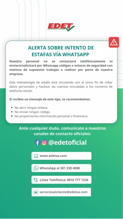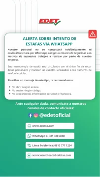 La empresa tucumána EDET emitió un comunicado a través de sus redes sociales advirtiendo a los usuarios acerca de intentos de estafa mediante Whatsapp.