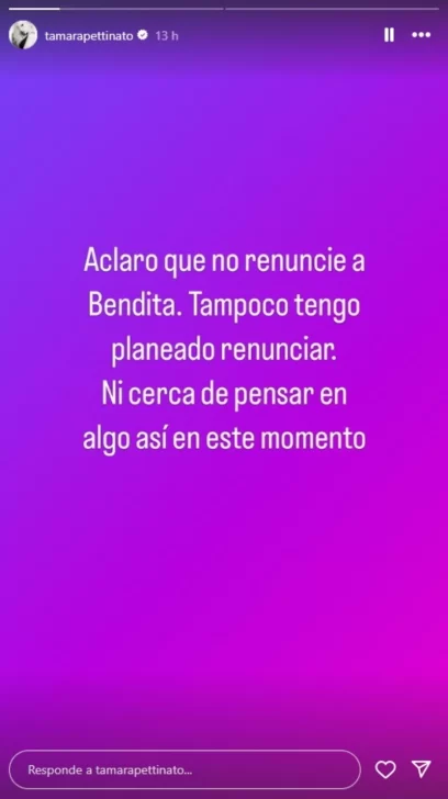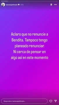 Asimismo, poco de que Beto hable en el inicio de bendita TV, Tamara Petinatto negó su renuncia con una publicación en redes sociales. Esta es su historia de Instagram.
