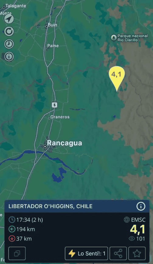 El Centro Sismológico Nacional (CSN) precisó que el sismo ocurrió a las 17:34 (hora chilena), con una profundidad de 37 kilómetros. El epicentro se localizó a 36 kilómetros de la ciudad de Rancagua, con coordenadas -33.965 grados de latitud y -70.427 de longitud.