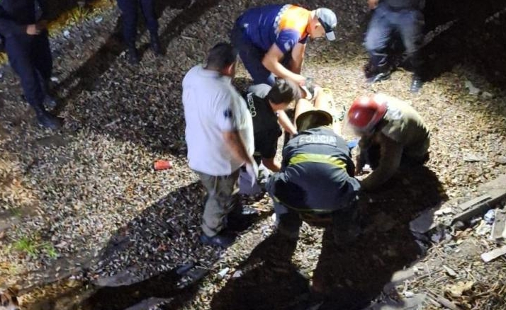 En las inmediaciones de las vías del ferrocarril, junto a los médicos del Sistema de Emergencias 107 que realizaron los primeros auxilios, los bomberos trasladaron a la joven, que se encontraba con signos vitales, en una camilla y con el uso de una escalera la llevaron hacia la ambulancia.